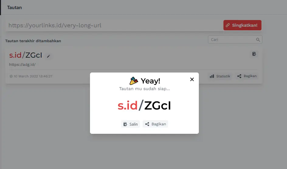 Catatan: Anda dapat menyesuaikan penyingkat tautan, menyalin ke papan klip, melihat statistik selama tujuh hari terakhir, atau membagikan tautan singkat Anda ke Facebook, Twitter, WhatsApp, atau kode QR. Lihat juga Fitur Tautan.