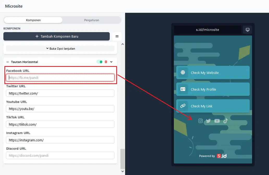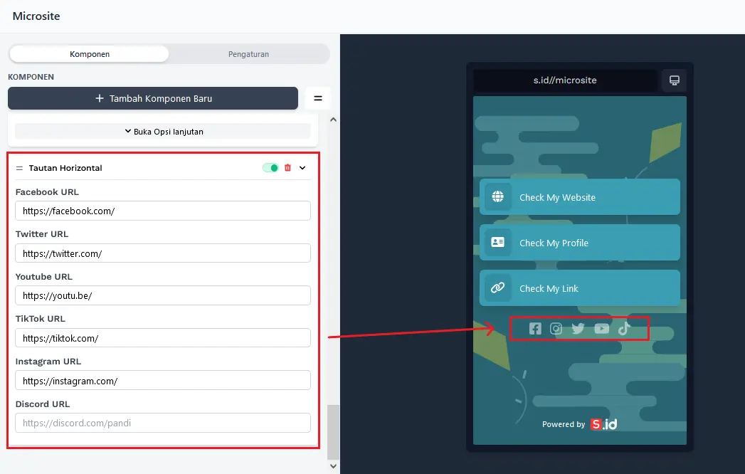 Masukkan** Tautan Media Sosial **Anda, dan hasilnya akan munculdalam bentuk ikon. Pastikan tautan yang Anda masukkan sudah benar agar pengunjung bisa langsung masuk ke media sosial Anda.