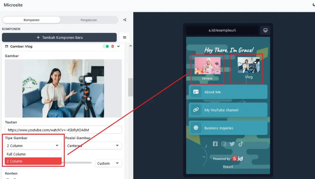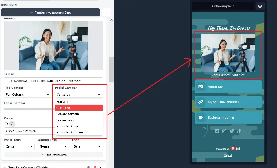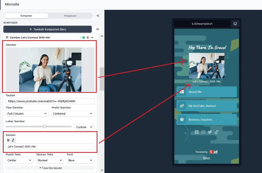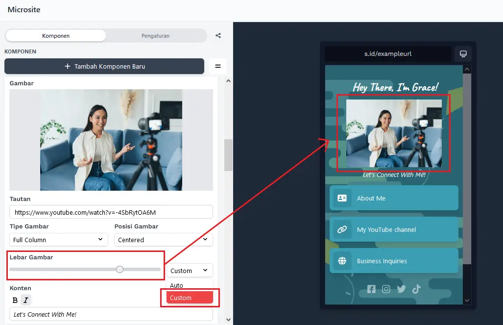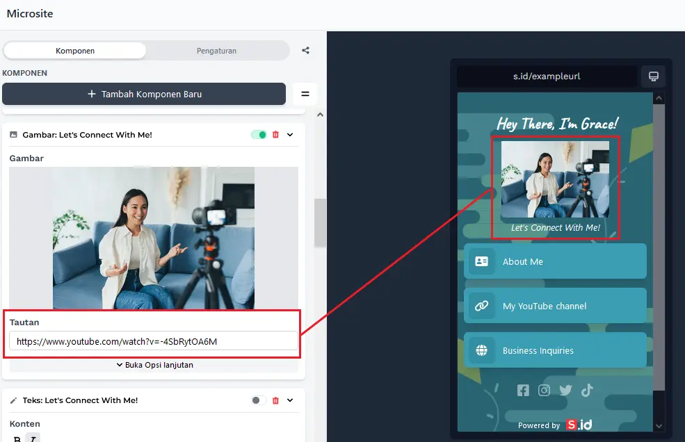 - Masukkan tautan anda (sosial media atau youtube channel) agar pengunjung langsung diarahkan ke link tersebut.