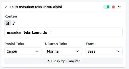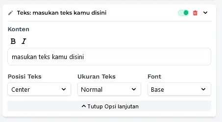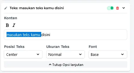Jika Anda tidak menyukai desain teks saat ini, Anda dapat mengubahnya menggunakan Fitur Teks, klik **Buka Opsi Lanjutan **untuk menampilkan semua fitur. Di bawah ini adalah deskripsi masing-masing fitur.