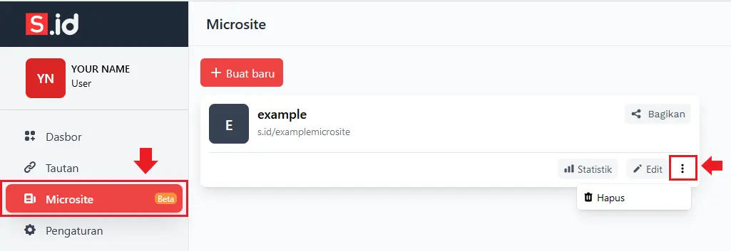 klik titik tiga pada microsite yang ingin anda hapus