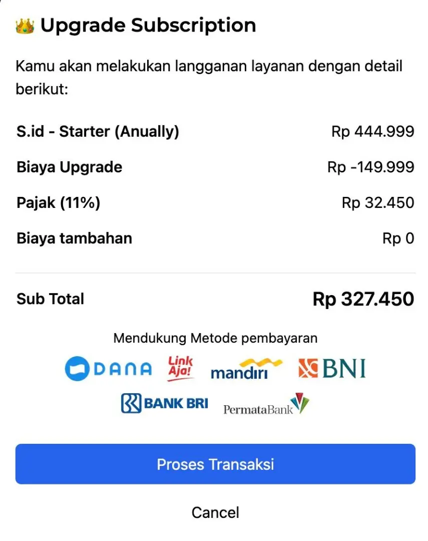 - Berikut harga dan potongan sisa dari langganan lite anda (promo potongan Rp 149,999 khusus bulan feb 2023) dan klik "Proses Transaksi"