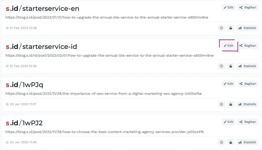 Pilih tautan yang ingin anda ubah, bisa juga di search tautan anda, kemudian klik Edit
