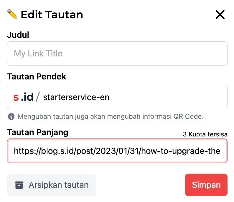 - Pada section **Tautan Panjang **anda bisa merubah alamat tujuan dan klik Simpan